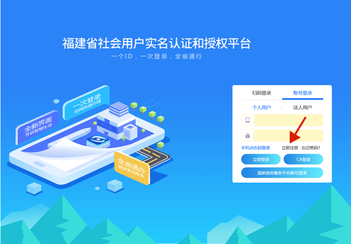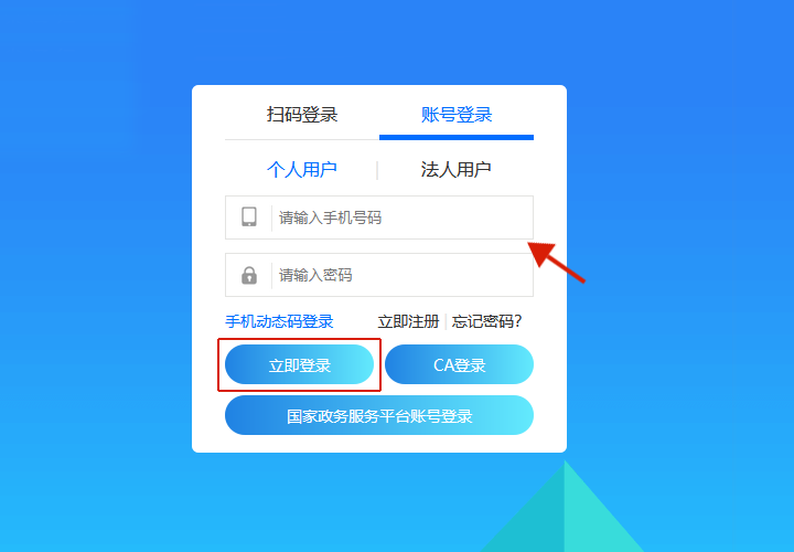 账号登录,根据您的身份选择入口,如“个人用户”输入手机,密码,点击立即登录。