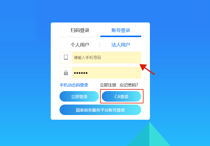 CA登录,根据您的身份选择入口,如“法人用户”输入手机,密码,点击立即登录。