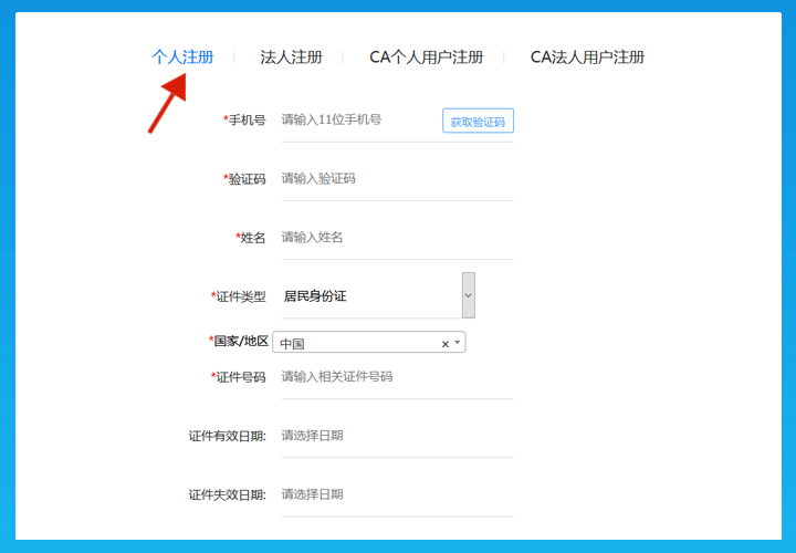 选择用户角色,进入身份认证页面,如选择“个人注册 ”,填写相关注册信息