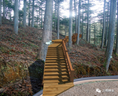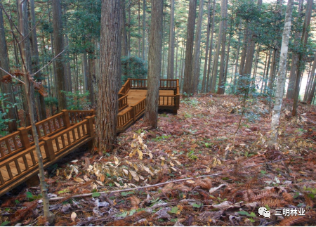 在明清园杉木大径材生态怡养基地建立自然教育基地、林业科普基地,修建森林观景台、森林瑜伽台、森林冥想与休憩亭、生态写生基地、森林书屋、生态文化解说系统等森林康养设施。