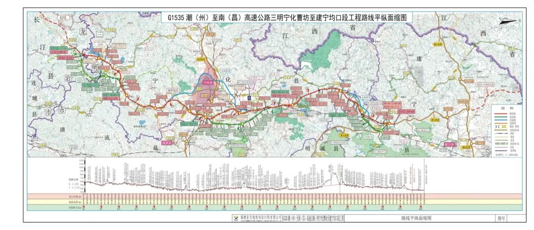 G1535潮州至南昌高速公路宁化曹坊至建宁均口段路线起于三明市宁化县曹坊镇滑石村,顺接拟建的潮南高速龙岩段终点,经宁化县曹坊镇、安乐镇、城南镇、城郊镇、中沙乡、水茜镇、安远镇,终于建宁县均口镇修竹村设均口枢纽互通接入G1517莆炎高速,路线全长约96公里(其中宁化段82.5公里,建宁段13.5公里),概算总投资约127.495亿元,全线设置治平、夏坊、安乐、宁化南、中沙、水茜、安远7处收费站及宁化、均口2处枢纽互通,设置客家、天鹅洞2处服务区。同步建设治平、中沙2条互通连接线及客家服务区出入口连接线。