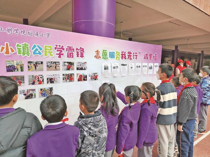 2018年起,三明学院附小先后成立“小蜜蜂义工队”“学雷锋小队”“学雷锋爱心联盟”,吸引大批学生报名,开展学雷锋活动。2020年10月,学校将三支队伍合并成小雷锋志愿服务队和小麒麟义工队两支学雷锋志愿服务队,分别负责校内和校外的卫生和秩序。