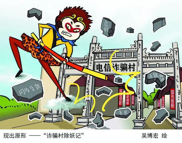孙悟空往前走去,见有一村庄,门口立一牌楼,上面刻有“电信诈骗村”五个大字。孙悟空朝村内望去,只见里面店铺林立,客人如织,每个客人进店皆钱包鼓鼓喜形于色,出店时则两手空空愁眉苦脸,不由得心生疑惑。于是运用法力唤出土地神,朝土地神喊道:“土地老儿,快带俺老孙瞧瞧,这些店是干什么营生?”