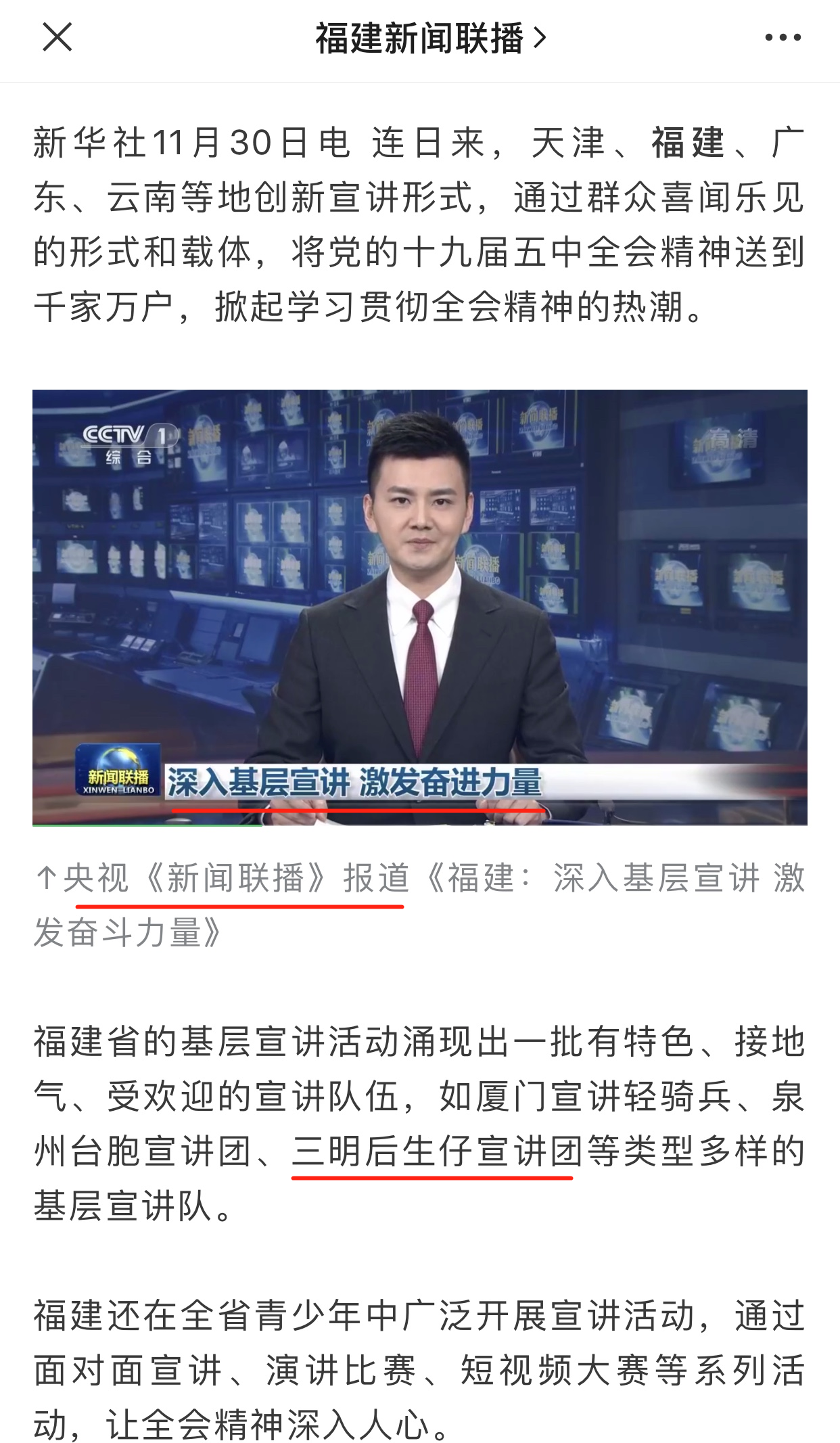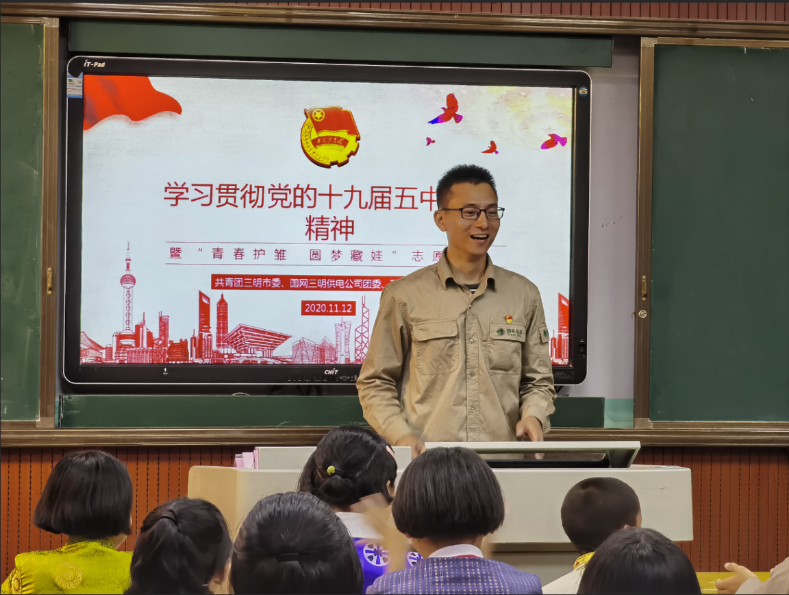 团市委班子成员带头走入学校,深入青年,宣讲十九届五中全会精神,将党的声音传到青年心中;充分利用线上线下平台,全市各级团组织通过微信公众号、电子屏、横幅等方式将全会精神宣传落到实处,并积极跟帖,扩大宣传力度,确保全会精神贯彻落实到位;组织由“新时代新三明百名担当作为青年先进”、团干部、青联委员、青年志愿者等青年宣讲人才组成的“三明后生仔宣讲团”,深入学校、田间地头、工厂车间、广场社区等基层一线进行宣讲,鼓励团干部、青联委员、百名担当青年等走进基层进行宣讲,推动全会精神在团员青年中入脑入心。列东中学西藏班的藏娃们在听了全国青联委员、国网三明供电公司电网志工吴长翔宣讲党的十九届五中全会精神后纷纷表示要更努力学好知识,回去建设家乡。目前全市已开展38场宣讲及学习会活动,“三明后生仔宣讲团”宣讲活动被央视新闻联播、新华社和中青报点赞报道。