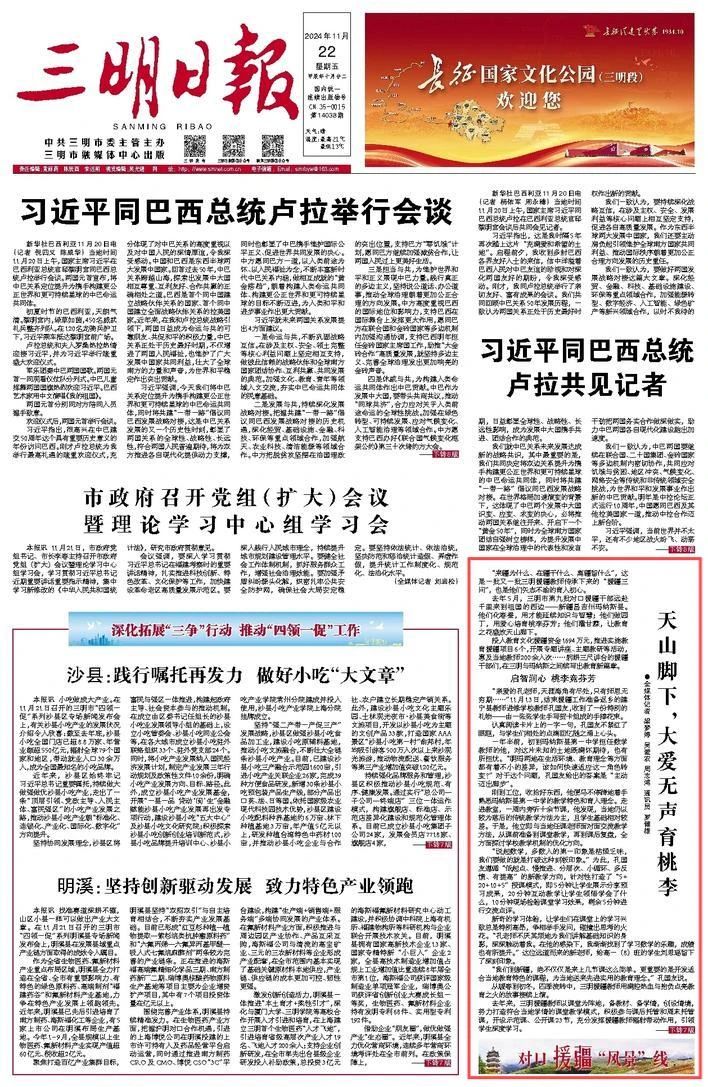 11月22日《三明日报》刊发《天山脚下,大爱无声育桃李》,介绍福建三明第九批援疆干部人才进疆以来坚持一任接着一任干,扎实推动教育援疆、智力援疆在玛纳斯县取得实实在在成效的故事。