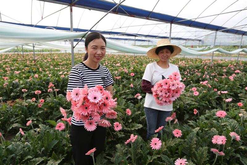 花农在花卉大棚采摘非洲菊陈汝辉摄