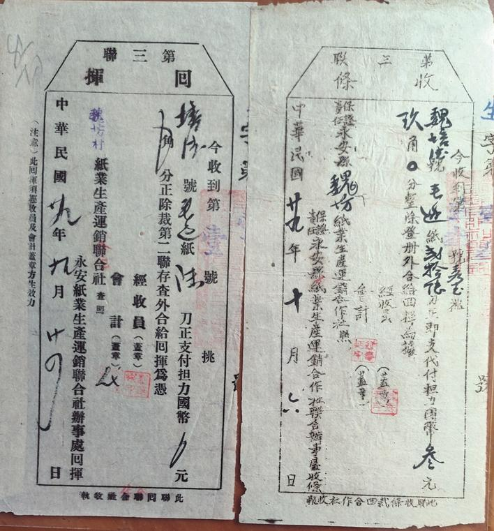1940年的“永安纸业生产运销联合社办事处回单”。(聂书专/收藏)