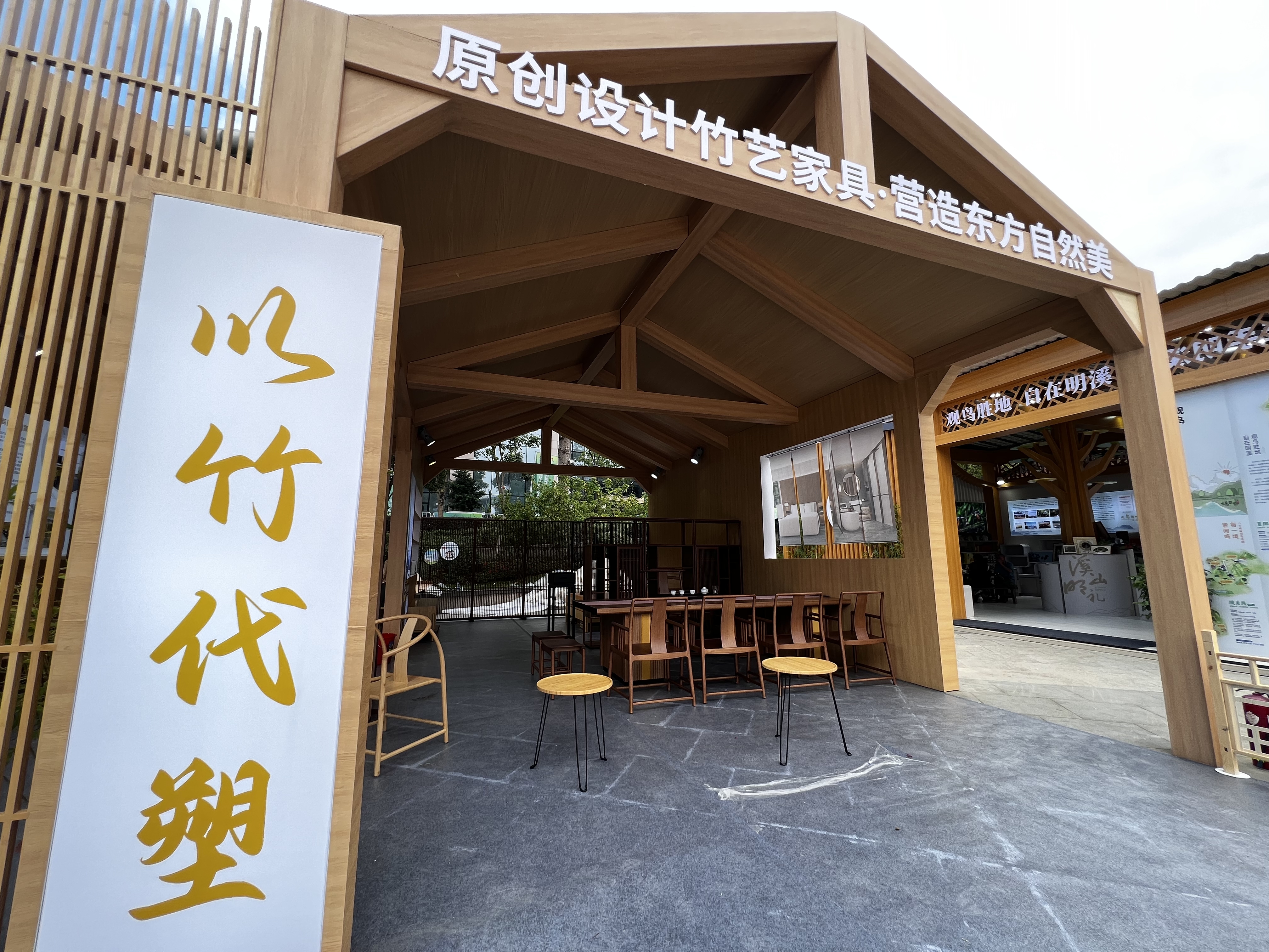 展馆分为上下两层,面积约200平方米,从屋顶墙面到桌椅橱柜均由竹木工艺打造。林前程表示,这是他们首次在林博会上打造全竹制展馆,展会结束后,这些竹制建筑材料还能接着循环利用。